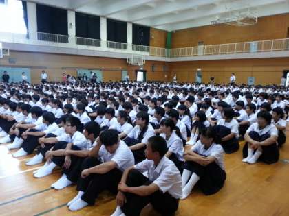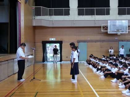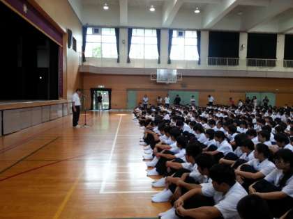 1学期の終業式は、体育館が工事で使えず中庭で行いました。