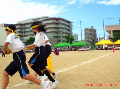 4人で棒を持ち、コーンを回ったり、みんなに飛んでもらったりと、クラス全体の協力が必要な競技です。