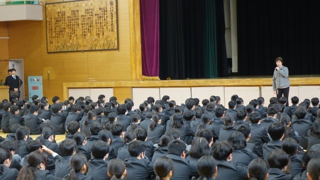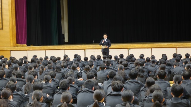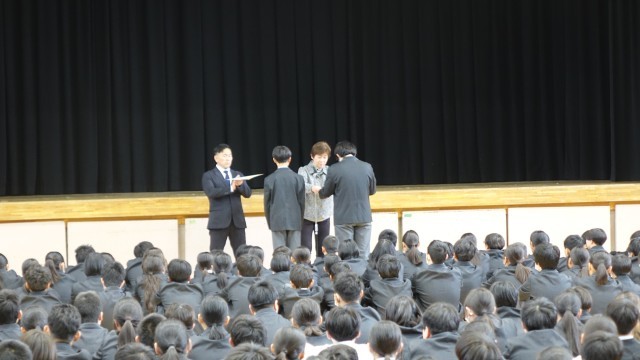その後に校長先生のお話などがあり、令和8年度前期生徒会役員認証式がありました。