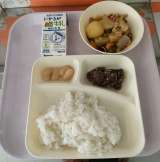 【献立】 くじらのたつたあげ 豚肉とじゃがいもの煮もの 白花豆の煮もの 米飯...
