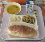 【献立】 わかさぎフライ スープ煮 ブロッコリーとコーンのサラダ 発酵乳 黒...
