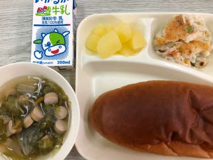 今日の給食では、マカロニ、牛乳、粉末チーズを使用したマカロニグラタンです。牛乳とチーズには、カルシウムが豊富に含まれています。