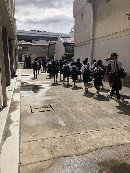 東門から学校を出ました。 晴れ間が出てきました。 暑くなりそうです。