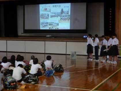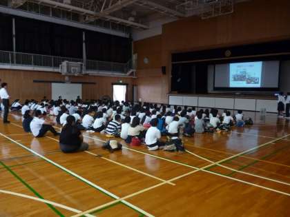 まずは体育館で生徒会執行委員から、中学校生活について紹介しました。