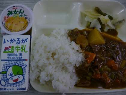 ビーフカレーライスには、原材料に小麦を使用していない「米粉のカレールーの素」を使っています。小麦アレルギーの生徒も食べられるようになっています。