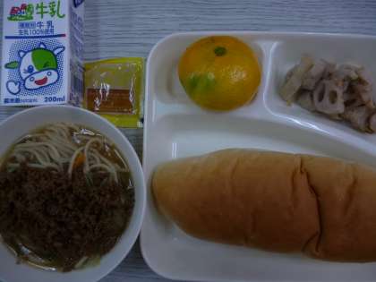 給食のタンタンめんには、チンゲンサイやもやし、にんじん、中華めんの入ったスープの上に、テンメンジャンや赤みそなどで味つけした牛と豚のひき肉をのせて食べます。