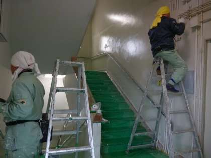 昨日23日(月)から、営繕園芸事務所の皆様に、南館階段の塗装作業をしていただいています。
