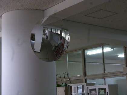 職員室前の柱に、大きなカーブミラーを設置しました。