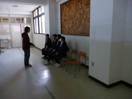 廊下で待機中も、先生の注意をよく聞いて、心の準備をしています。