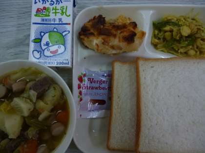 給食では牛肉とウインナー、じゃがいも、キャベツ、にんじん、パセリを使っています。