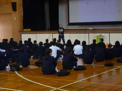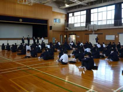 配布物を手にし、学年集会でいろいろなお話を聞きました。