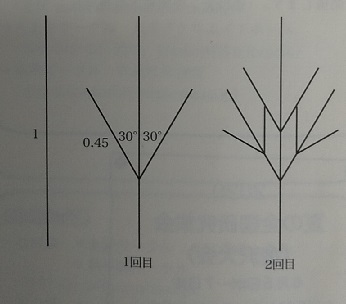 次に3本の枝について同じように、それぞれの長さを1として、長さ0.3のところから、左右に30°の方向に長さが0.45の枝を伸ばします。