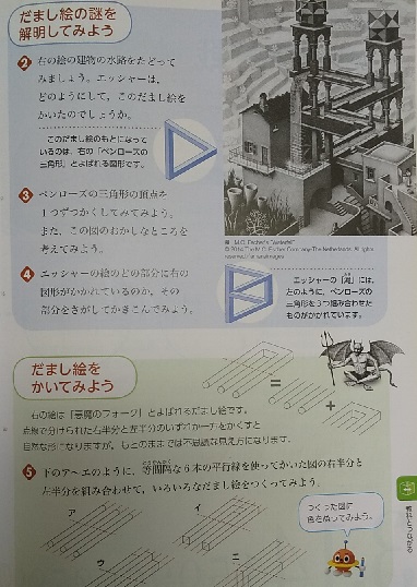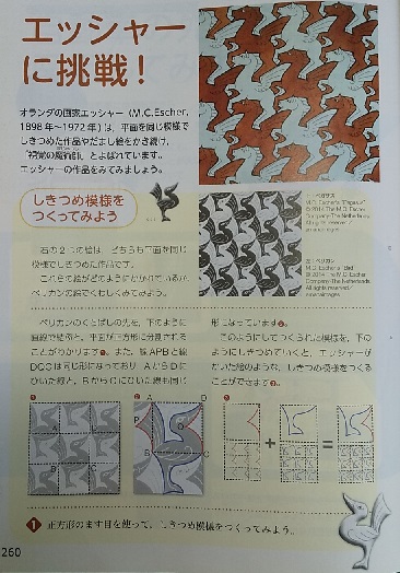 1年生の数学の教科書P.260と261には『エッシャーに挑戦』という課題が載っています。