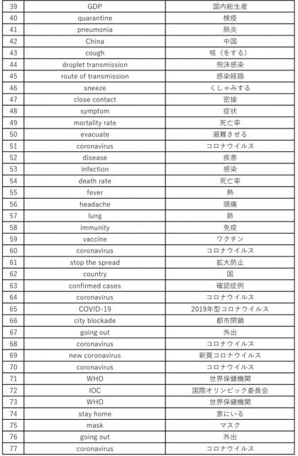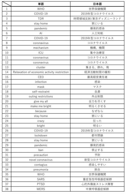 また、今日回収の宿題で集めた「臨時休業中の気になる・よく見る英単語」を一覧にしました。自分以外の人がどんな単語を見つけられたのか要checkです。