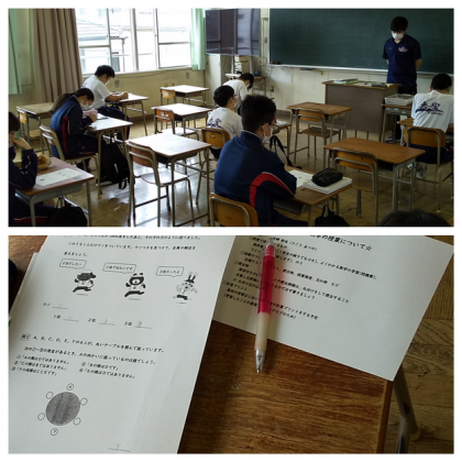(写真中)数学オリエンテーションでは、ワークシート『推理算にチャレンジ』をしました。