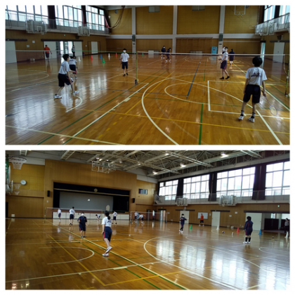 (写真下)体育実技は、『バドミントン』を行いました。本校の広い体育館の利点を活かして、ゆったりと体を動かすことができました。