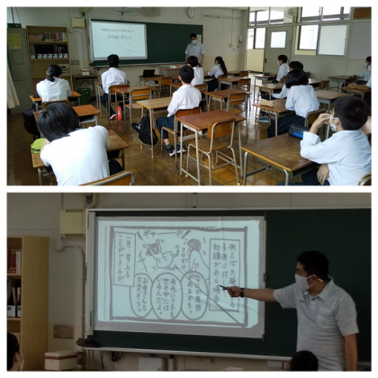 (写真上)”自分で考える””不思議に思う”ことは、すべての学習に共通する大切なことです。加えて、社会(公民)では現実の社会のことを扱うので、”情報を様々な視点で分析する””批判的な見方(クリティカルシンキング)”が大切になります。写真やイラストを用いて”考え方”について学んだ後、4月28日の記事で紹介した動画『ウイルスの次にやってくるもの(病気・不安・差別)』を視聴しました。