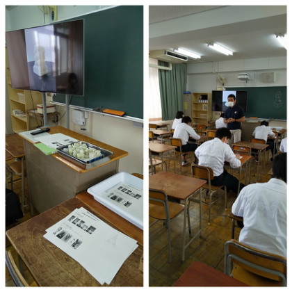 (写真中)美術の授業は、『てん刻』でした。完成形のイメージを膨らませるため、お手本として卒業生の作品を紹介しました。その後、プリントで”世界の塔”や”トロフィー”の写真を参考に、イメージ図を描きました。