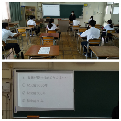 (写真下)理科の授業では、『磁石』の補充学習と、新型コロナウイルス関連のクイズ学習をしました。写真の問題を復習しましょう。Q:「石鹸が使われ始めたのは?」A:「1.紀元前3000年 2.紀元前300年 3.紀元前30年」