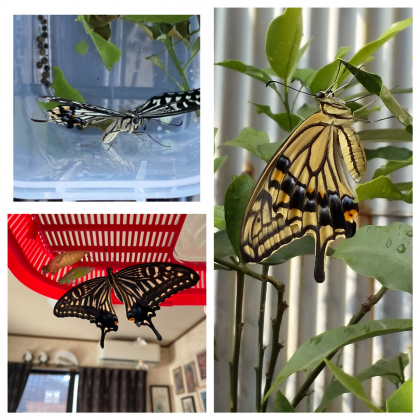 (写真上)5月中旬、家の植木(キンカン)から幼虫数匹を虫かごに避難(?)させました。そのままだと、ほぼすべての幼虫は鳥に食べられてしまいます。《自然界の生存競争は厳しい》
