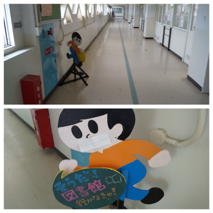 (写真上)図書室坊や(仮称)が廊下に出ていたら、開館の合図です。皆さんが安心して利用できるように『マスク着用』です。