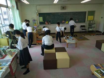 (写真中)生徒は適度な密度で、ゆったりとくつろいでいました。返却・貸出を利用している生徒もいました。