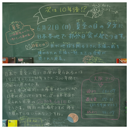 (写真下)前方黒板の季節の話題は、『夏至と日食』です。「次の日食は10年後?」「夏至と日食の重なりは、ここ300年で一度きり?」6月21日の夕方は、晴れるといいね。