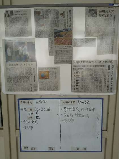 (写真下)3年生は、昨年から続く「新聞記事の切り抜き」です。世の中の出来事や他者の生き様からたくさん学んでください。