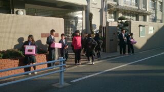 生徒会役員が朝早くから正門で募金活動を行っています。
