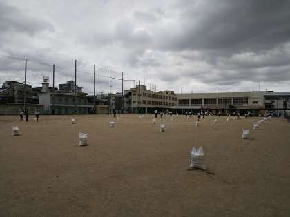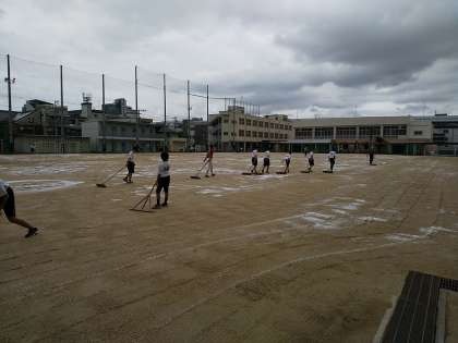 15:00からは、運動場使用部活動の生徒を中心に、「にがりまき」をしました。