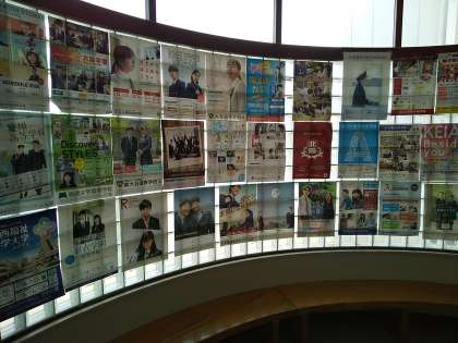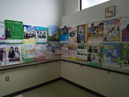 (写真中と下)西館階段踊り場や談笑スペースに貼ってある「高等学校等の生徒募集ポスター」
