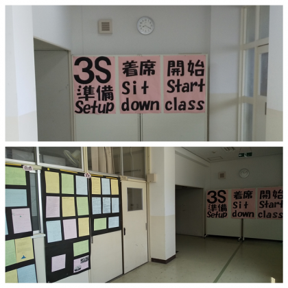(写真上)3年生2階廊下の突き当りには、学年の月間目標が大きく掲示してあります。「3S=三つのエス」というキーワードでメリハリをつけて授業準備をする取組みです。詳しくは学年通信をお読みください。