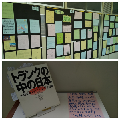 (写真中)3年生2階廊下側面には「調べ学習レポート」が掲示されています。もともとの修学旅行の行き先だった長崎県について、産業・原爆・自然・文化の4つの角度から発表しています。