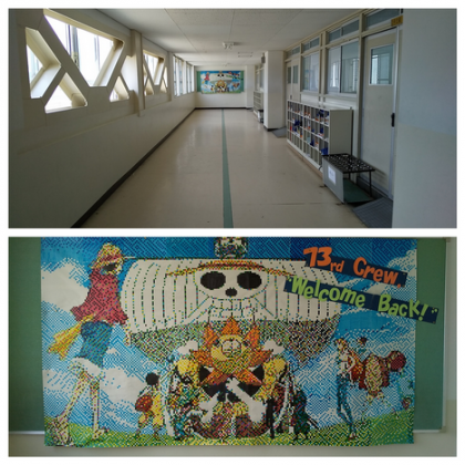 (写真下)2年生廊下の突き当りには、モザイクアート壁画が展示されています。臨時休業期間に生徒の登校を心待ちにしながら学年の先生が創りあげました。壁画の内容は学年通信の題名「CREW」とリンクしています。