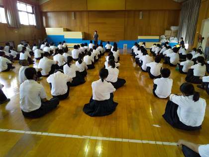 1,2限目授業のあと、3,4限目は密にならないように場所をスライドさせながら学年ごとに「学年集会」と「一斉美化」をしました。