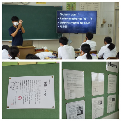 (写真上)本時の目標「Today's goal」が示されています。教室の後ろには、ニュースを「英文・和訳・キーワード」に整理して提示してあるコーナーがありました。