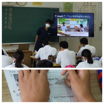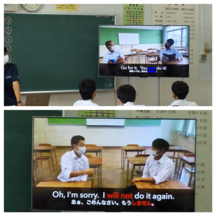(写真中・下)8種類の助動詞の使い方について、生徒が出演する8本のショートムービーを使って学習しています。学校生活に出てきそうな会話文で、自然に学習できるように工夫されていました。