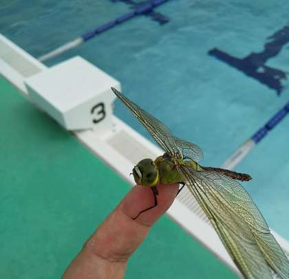 水面に卵を産んでいた『ギンヤンマ』が、水しぶきに巻き込まれたようです。指先を貸すと、翅が乾くまで一休みして、飛び立っていきました。