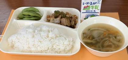 今日の給食では、豚ばら肉をゆでてから、キャベツやピーマンと一緒にいためてテンジャンなどで味つけしています。