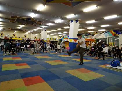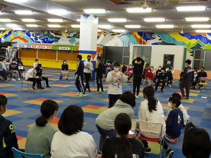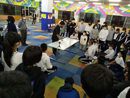 「○?クイズ」の回答に身体を張る学年主任や手品も飛び出し盛り上がりました。