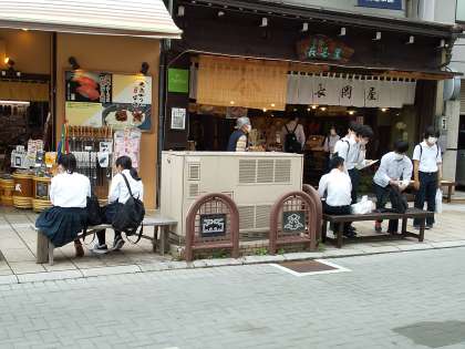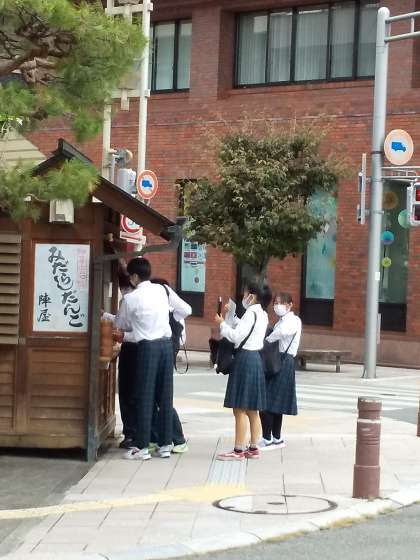 街かどグルメも散策のひとつの楽しみです。店の前で行儀よく「いただきます」