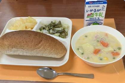 給食では、沖縄県で栽培(さいばい)されたパインアップルを使用し、たべやすく切って缶詰(かんづめ)にしています。