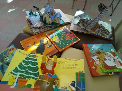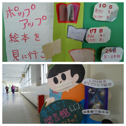 現在、図書室では『ポップアップ絵本展』を開催しています。