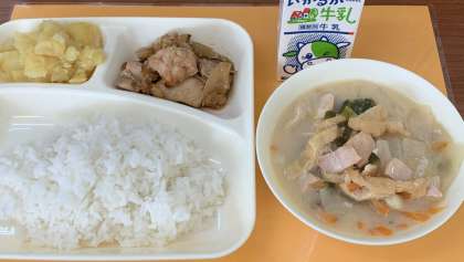 今日の給食のかす汁には、さけ、つきこんにゃく、うすあげ、だいこん、にんじん、青ねぎが入っています。酒かすのほかに、うす口しょうゆ、白みそ、赤みそで味つけしています。