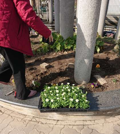 気候が不安定で、特に今週は雨が降り気温の変動も激しかったのですが、火曜日はぽかぽかとした陽射しの中で、緑化活動に地域の方が参加いただき、寒さで凍えていた草花を植え替えて、華やかになりました。