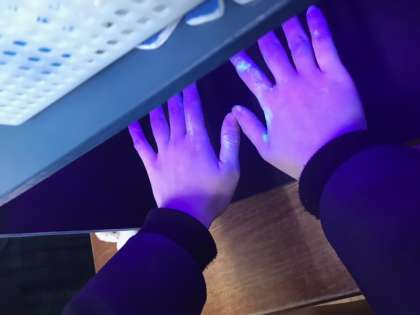手洗いチェッカーは、専用ローションを手についた汚れに見立てて塗り、手洗い後特殊ライトの下に手をかざすと洗い残しが光り、適切な手洗いができているか確認できます。