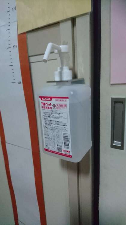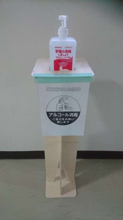 保健室入り口と移動式の消毒液設置き場を管理作業員さんに制作していただきました。