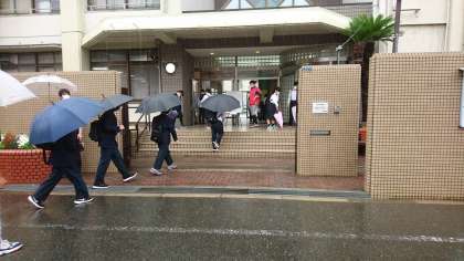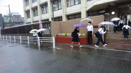 今日の登校時間中は、激しい雨の中の登校となりました。今後も雨が続く予報が出ていますが、安全に注意して登下校してください。特に、傘をさしての登下校では車等に注意し、交通事故に十分注意してください。