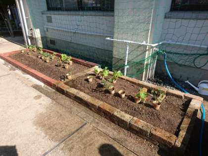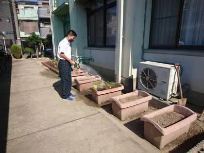 3年生技術の時間に生物の育成に取り組んでいるトマト・ナス・キュウリの苗が成長しています。今日も朝の水やりを当番の生徒が行い、大きな実がなるように育てています。