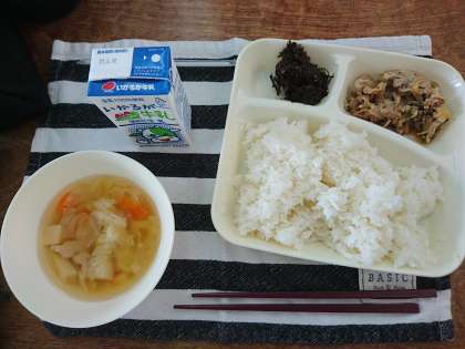 豚肉のゴマみそ焼き、すまし汁、のりのつくだ煮、牛乳が今日のメニューです。手際よく給食の準備を行っています。